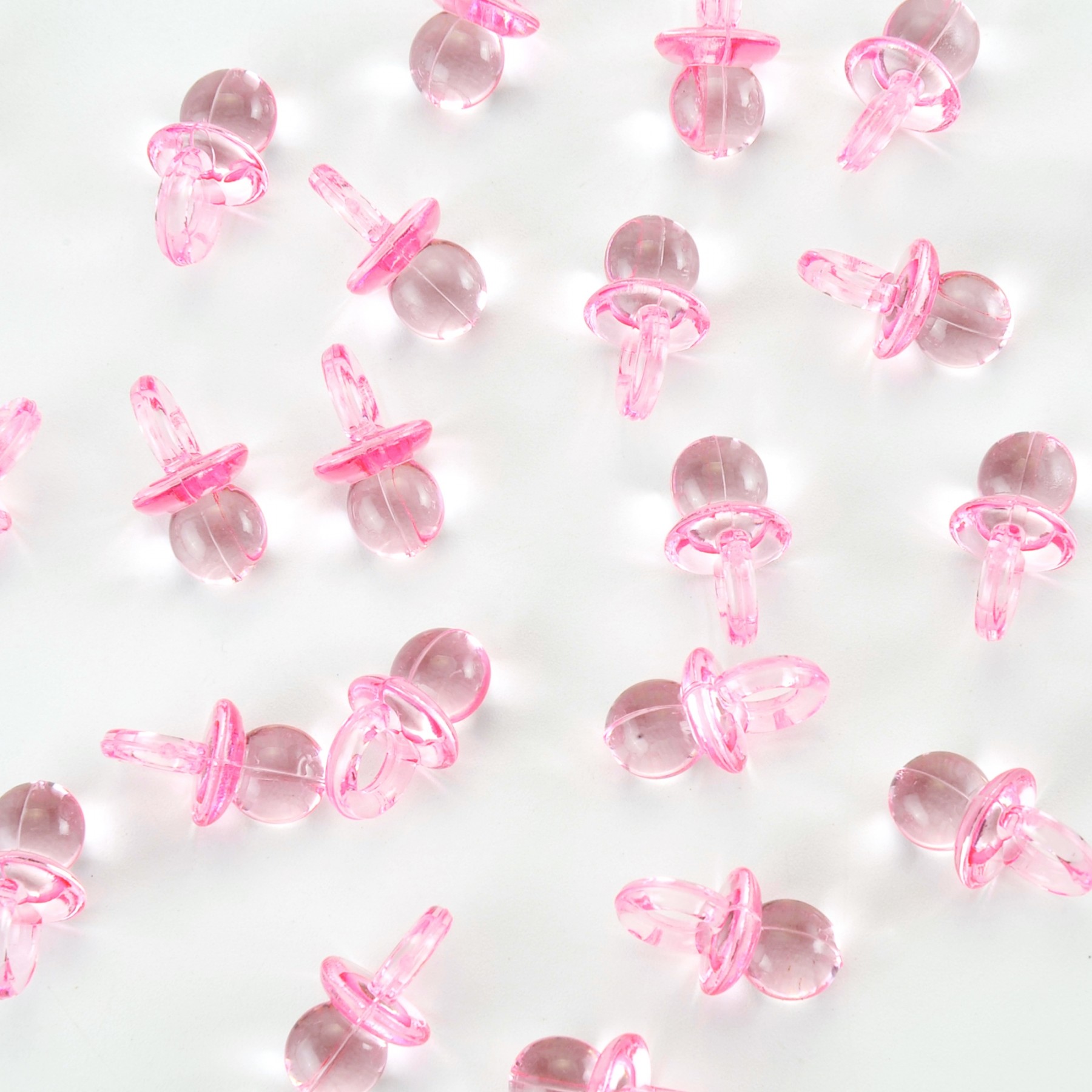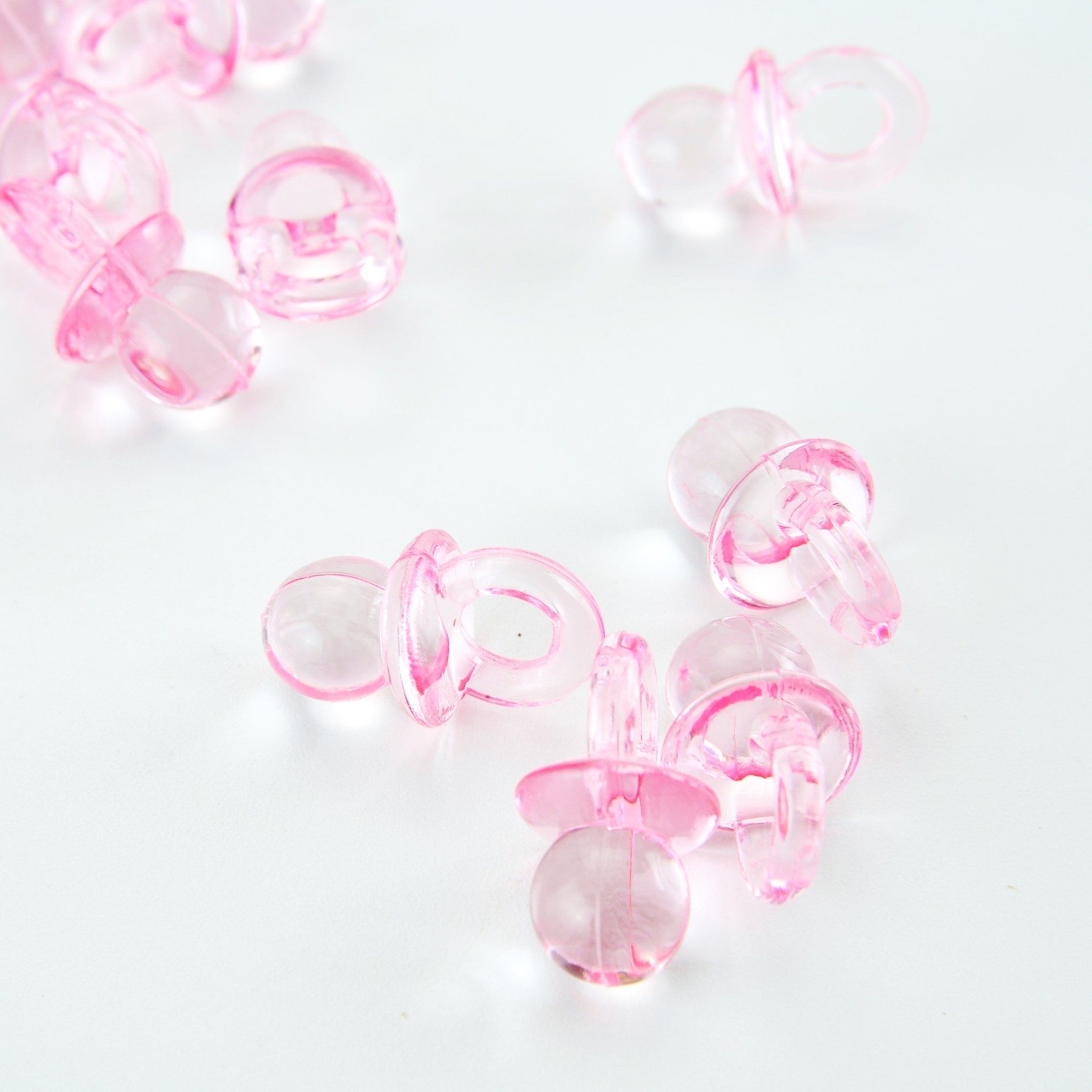 Mini acrylic baby pacifiers (Pink). Great for baby shower decorations, party favors, mini games and more.